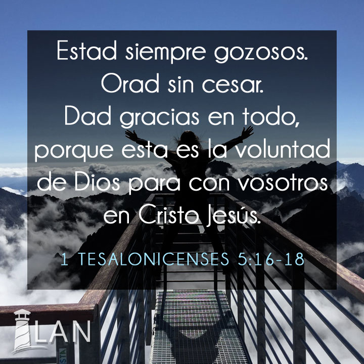 1 Tesalonicenses 5:16-18 Publicado el 7 mayo, 2019 por MinisteriosLAN Compártelo: Haz clic para compartir en X (Se abre en una ventana nueva) X Haz clic para compartir en Facebook (Se abre en una ventana nueva) Facebook Me gusta Cargando... Relacionado